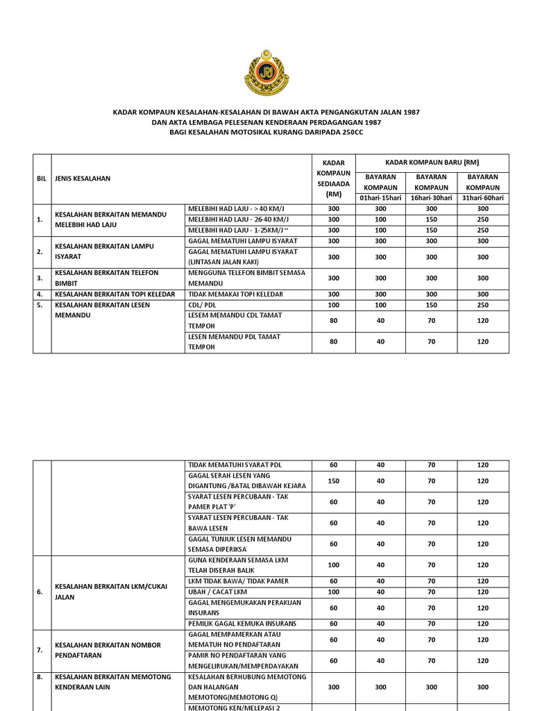 Berikut adalah kadar kompaun bagi setiap kesalahan. Tidak memakai topi keledar RM100. Memotong barisan secara berbahaya RM150.
